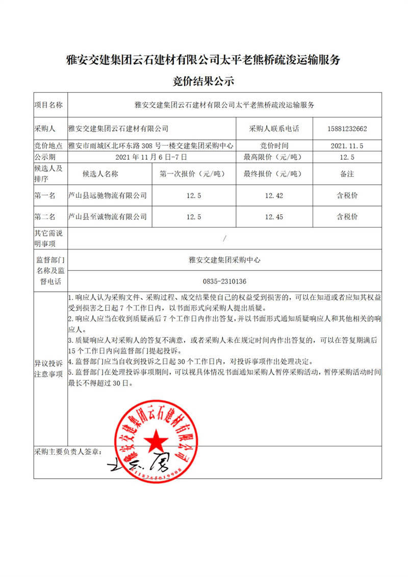 雅安交建集團(tuán)云石建材有限公司太平老熊橋疏浚運(yùn)輸服務(wù)競價結(jié)果公示
