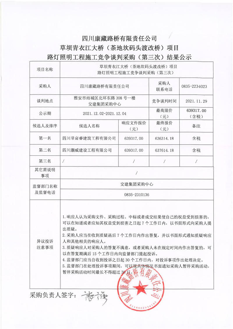 四川康藏路橋有限責(zé)任公司草壩青衣江大橋(茶地坎碼頭渡改橋)項目路燈照明工程施工競爭談判采購(第三次)結(jié)果公示