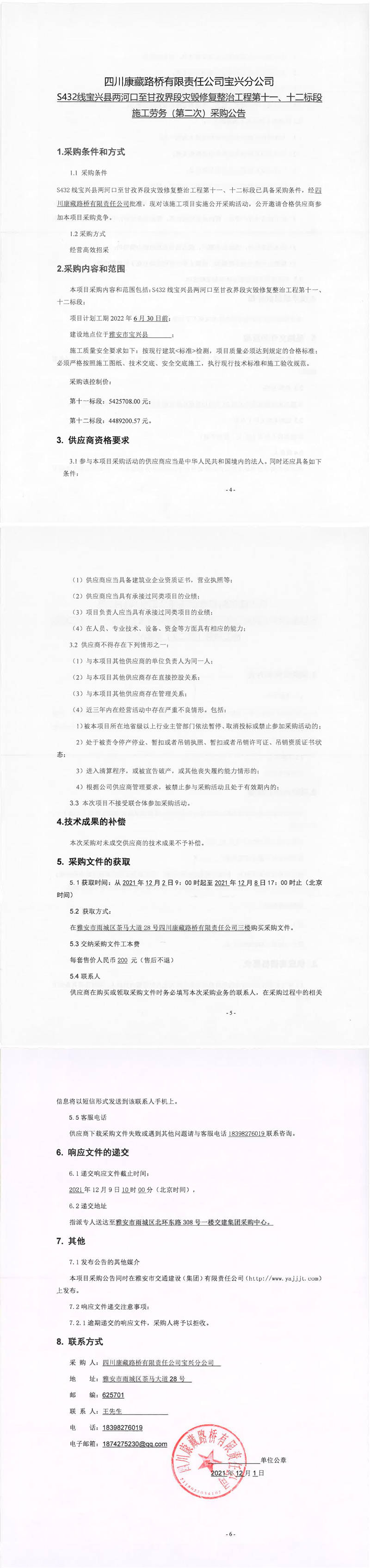 四川康藏路橋有限責(zé)任公司S432線寶興縣兩河口至甘孜界段災(zāi)毀修復(fù)整治工程第十一、十二標段施工勞務(wù)(第二次)采購公告