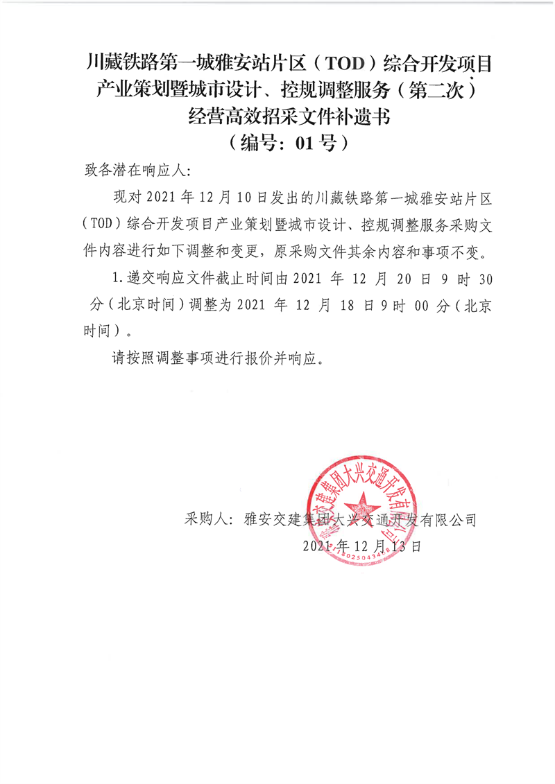 雅安交建集團(tuán)大興交通開(kāi)發(fā)有限公司川藏鐵路第一城雅安站片區(qū)(TOD)綜合開(kāi)發(fā)項(xiàng)目產(chǎn)業(yè)策劃暨城市設(shè)計(jì)、控規(guī)調(diào)整服務(wù)(第二次)經(jīng)營(yíng)高效招采文件補(bǔ)遺書(編號(hào):01號(hào))
