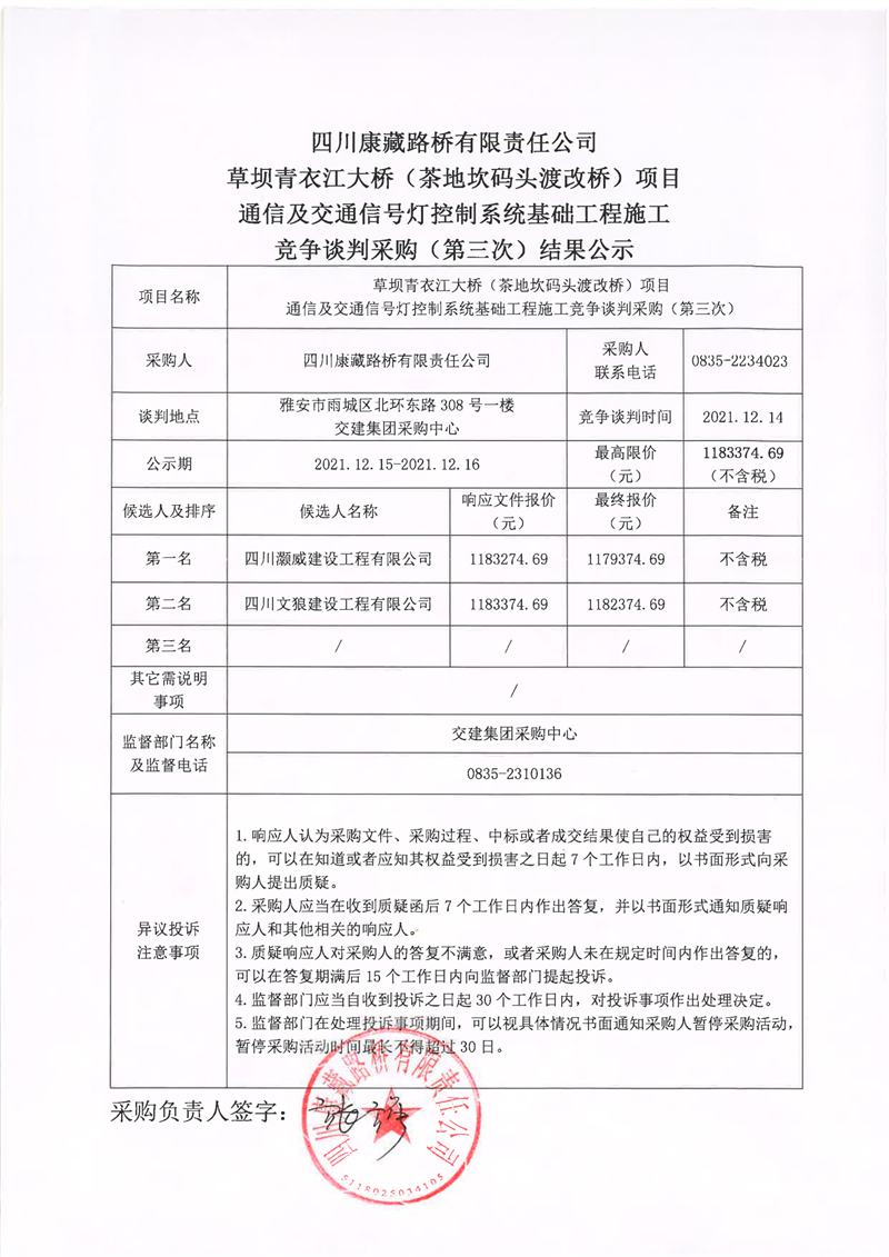 四川康藏路橋有限責任公司草壩青衣江大橋(茶地坎碼頭渡改橋)項目通信及交通信號燈控制系統(tǒng)基礎(chǔ)工程施工競爭談判采購(第三次)結(jié)果公示