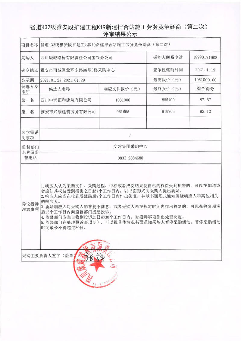 四川康藏路橋有限責任公司寶興分公司省道432線雅安段擴建工程K19新建拌合站施工勞務競爭磋商(第二次)評審結(jié)果公示