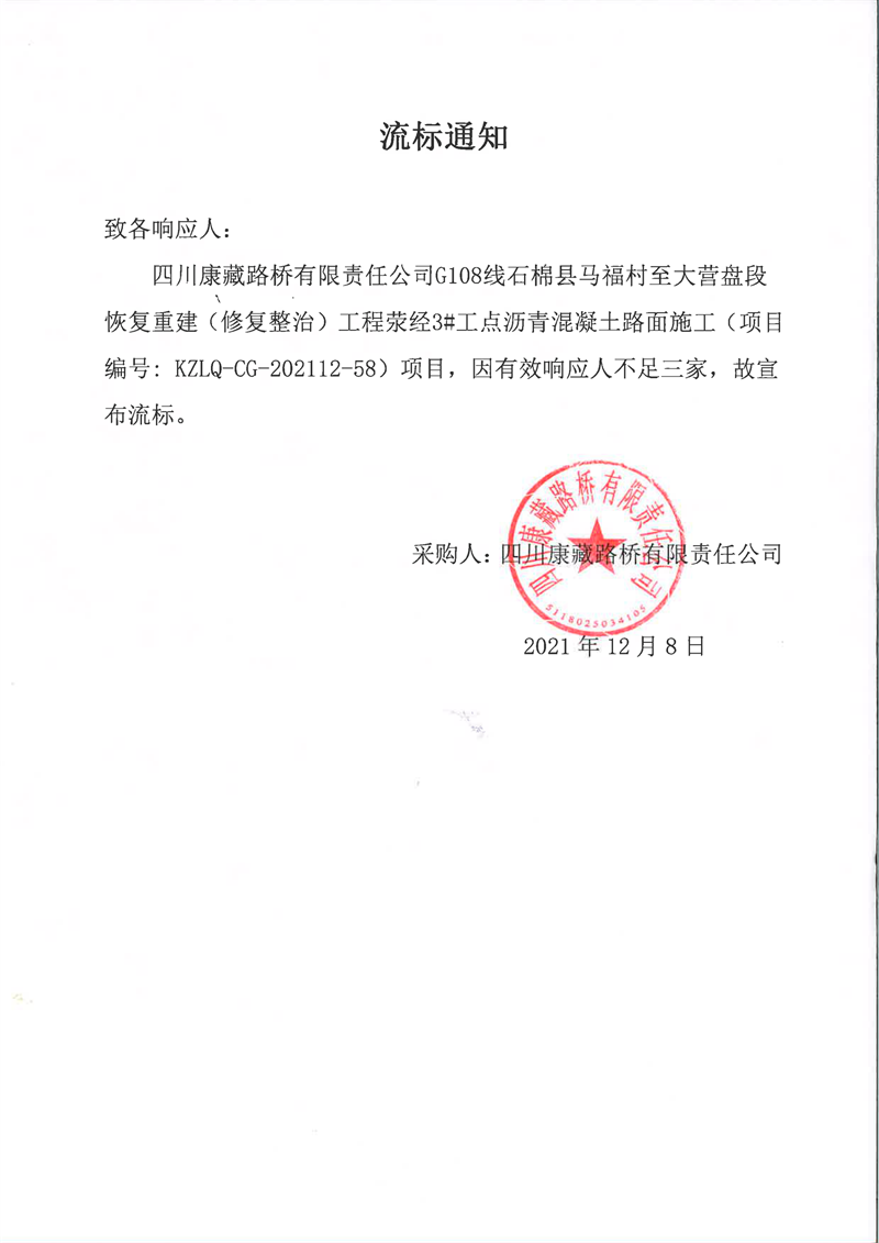四川康藏路橋有限責(zé)任公司G108線石棉縣馬福村至大營盤段恢復(fù)重建(修復(fù)整治)工程滎經(jīng)3#工點(diǎn)瀝青混凝土路面施工流標(biāo)通知