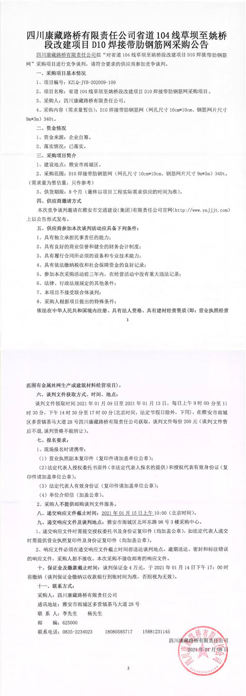 四川康藏路橋有限責(zé)任公司省道104線(xiàn)草壩至姚橋段改建項(xiàng)目D10焊接帶肋鋼筋網(wǎng)采購(gòu)公告