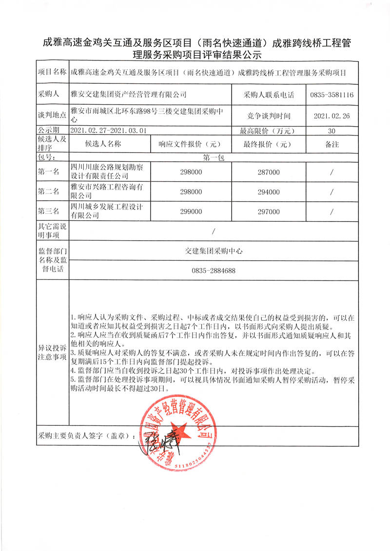 雅安交建集團(tuán)資產(chǎn)經(jīng)營(yíng)管理有限公司成雅高速金雞關(guān)互通及服務(wù)區(qū)項(xiàng)目(雨名快速通道)成雅跨線橋工程管理服務(wù)采購(gòu)項(xiàng)目評(píng)審結(jié)果公示