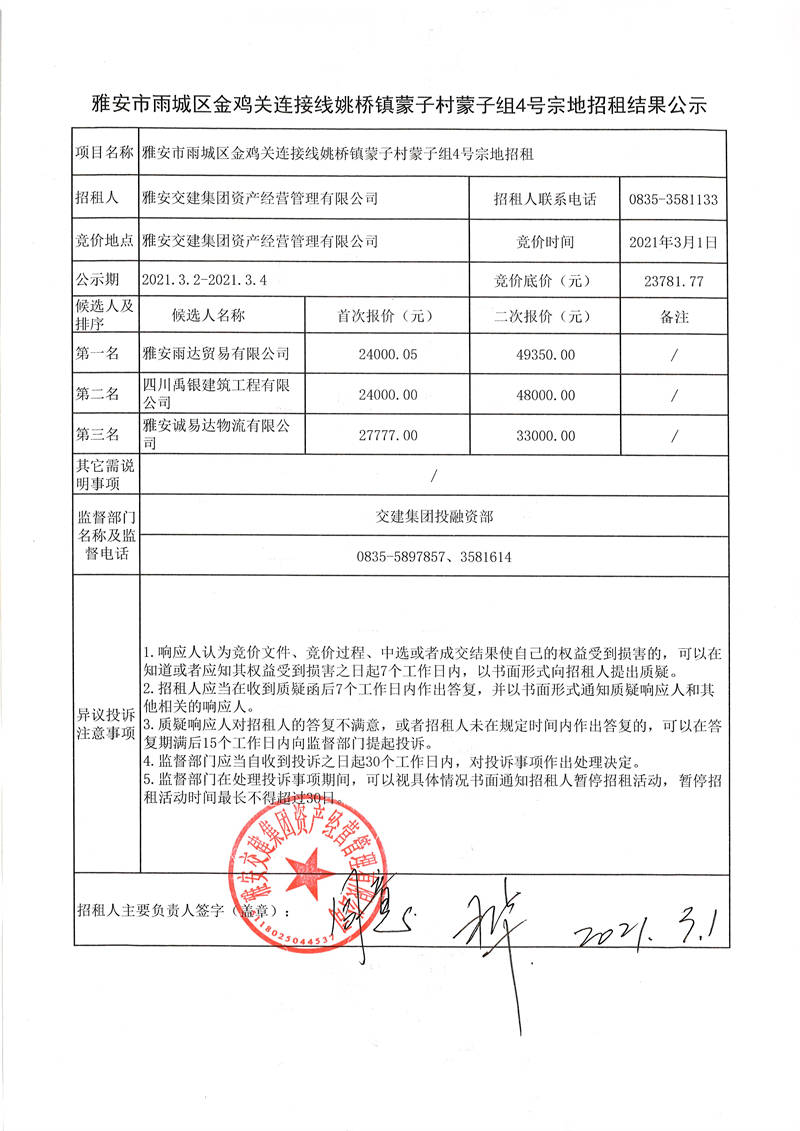 雅安交建集團資產(chǎn)經(jīng)營管理有限公司雅安市雨城區(qū)金雞關連接線姚橋鎮(zhèn)蒙子村蒙子組4號宗地招租結(jié)果公示