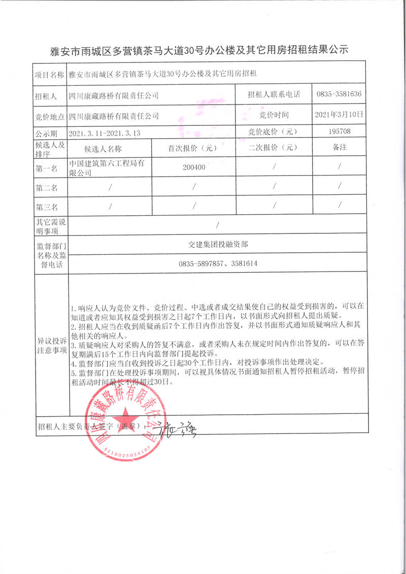 四川康藏路橋有限責(zé)任公司雅安市雨城區(qū)多營鎮(zhèn)茶馬大道30號(hào)辦公樓及其它用房招租結(jié)果公示