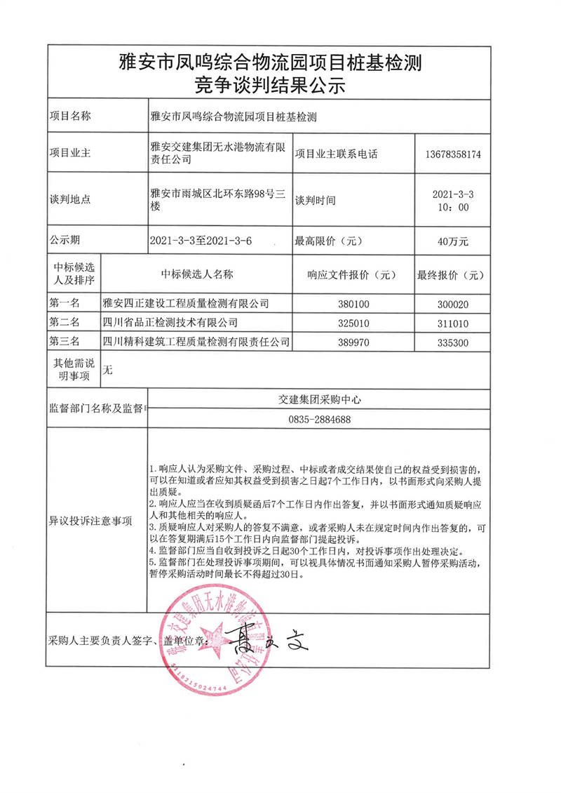 雅安交建集團(tuán)無(wú)水港物流有限責(zé)任公司雅安市鳳鳴綜合物流園項(xiàng)目樁基檢測(cè)競(jìng)爭(zhēng)談判結(jié)果公示