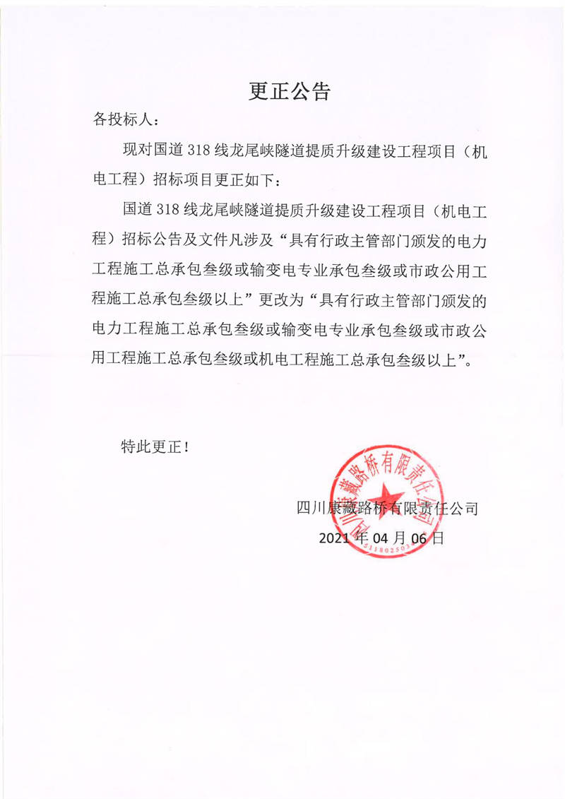 四川康藏路橋有限責(zé)任公司國道318線龍尾峽隧道提質(zhì)升級(jí)建設(shè)工程項(xiàng)目(機(jī)電工程)更正公告