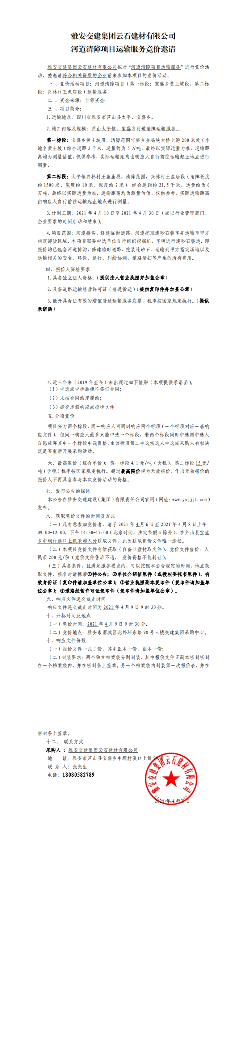 雅安交建集團云石建材有限公司河道清障項目運輸服務(wù)競價公告