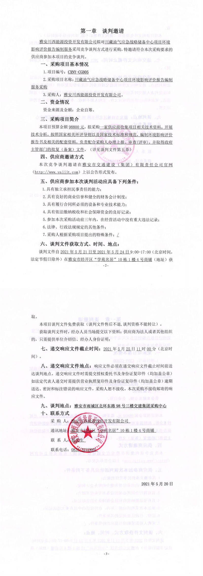 雅安川西能源投資開發(fā)有限公司川藏油氣應(yīng)急戰(zhàn)略儲(chǔ)備中心項(xiàng)目環(huán)境影響評(píng)價(jià)報(bào)告編制服務(wù)采購競(jìng)爭(zhēng)談判公告