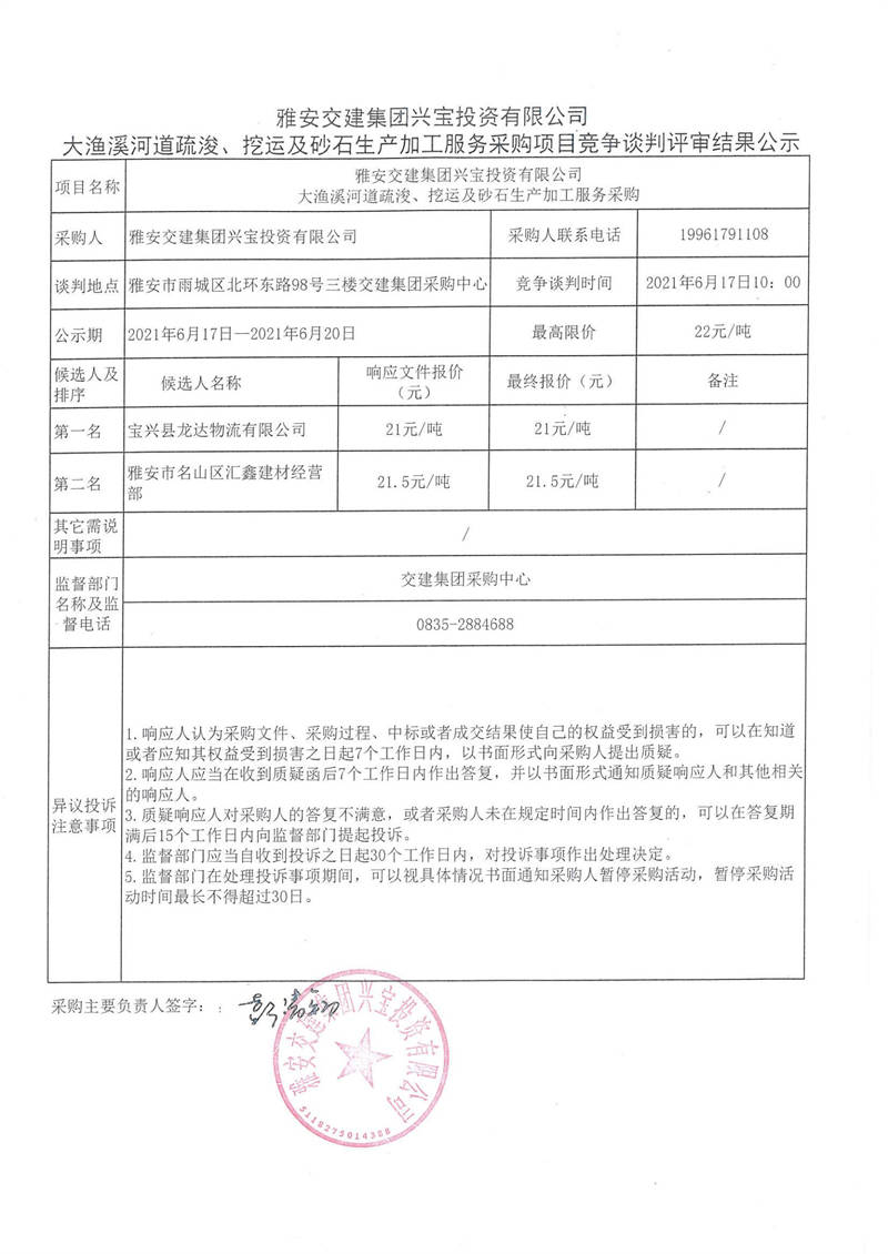 雅安交建集團興寶投資有限公司大漁溪河道疏浚、挖運及砂石生產(chǎn)加工服務(wù)采購項目競爭談判評審結(jié)果公示