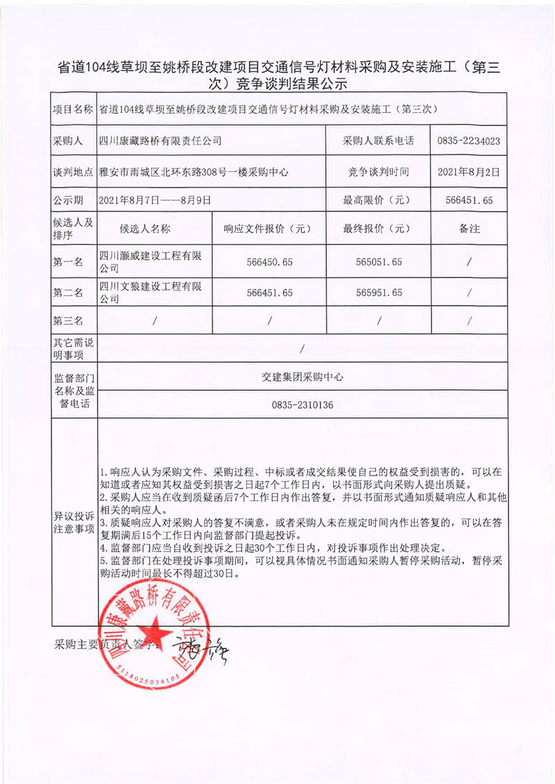 四川康藏路橋有限責(zé)任公司省道104線草壩至姚橋改建項(xiàng)目交通信號燈材料采購及安裝施工(第三次)競爭談判結(jié)果公示