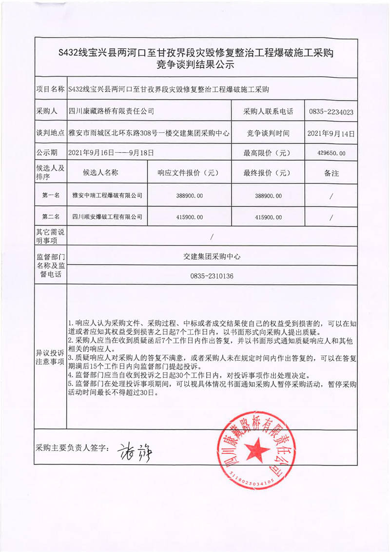 四川康藏路橋有限責任公司S432線寶興縣兩河口至甘孜界段災毀修復整治工程爆破施工采購競爭談判結果公示