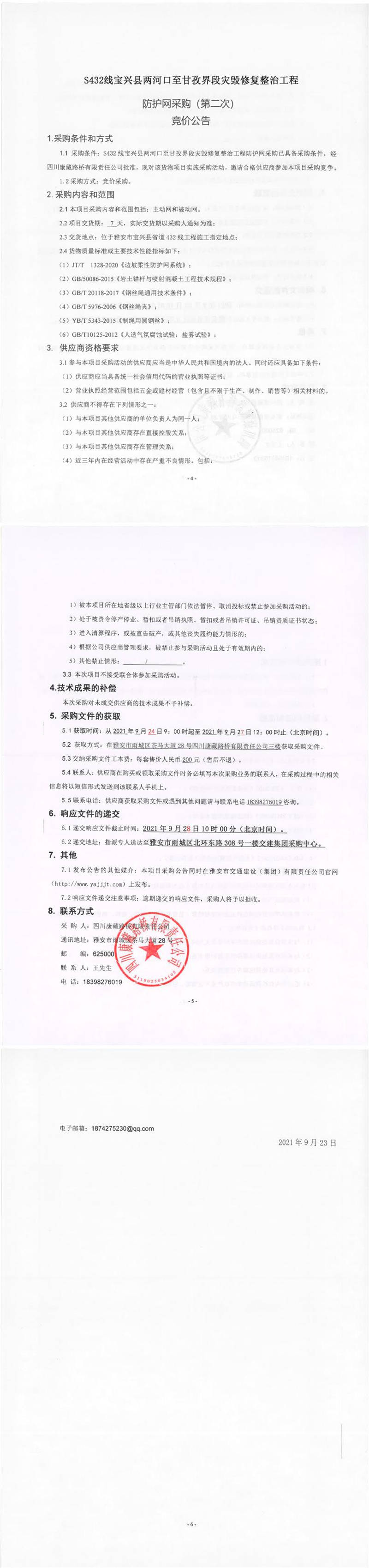 四川康藏路橋有限責(zé)任公司S432線寶興縣兩河口至甘孜界段災(zāi)毀修復(fù)整治工程防護網(wǎng)采購(第二次)競價公告