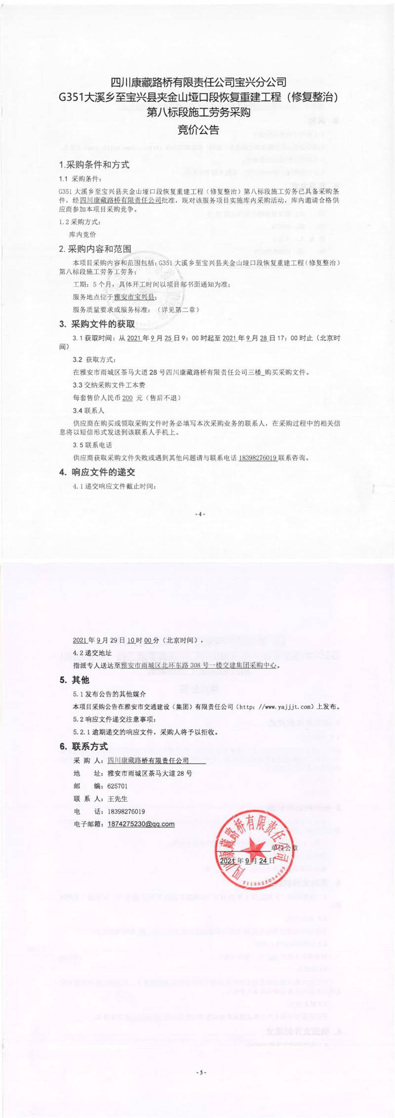 四川康藏路橋有限責(zé)任公司寶興分公司G351大溪鄉(xiāng)至寶興縣夾金山埡口段恢復(fù)重建工程(修復(fù)整治)第八標(biāo)段施工勞務(wù)采購競(jìng)價(jià)公告