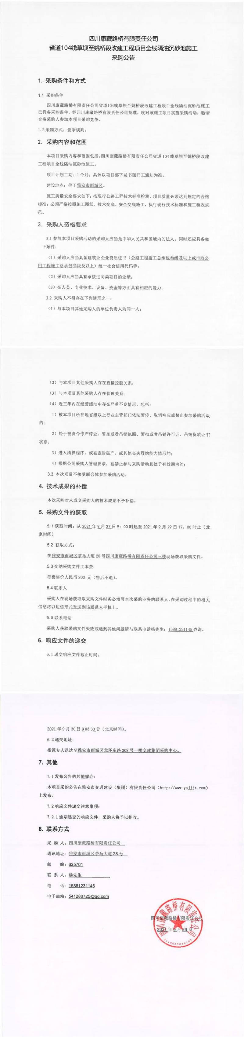 四川康藏路橋有限責(zé)任公司省道104線草壩至姚橋段改建工程項目全線隔油沉砂池施工采購公告