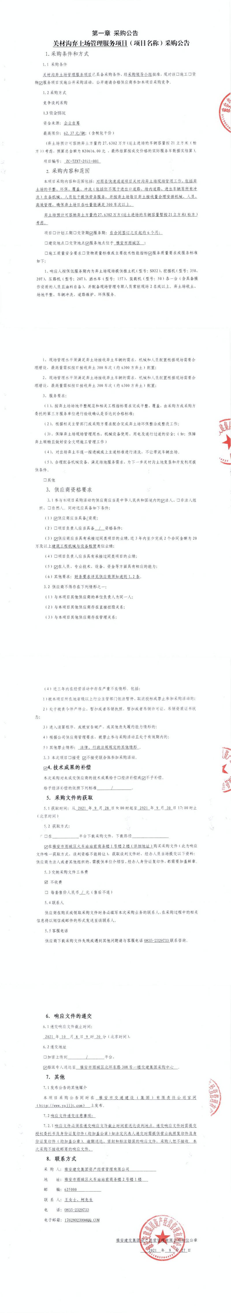 雅安交建集團(tuán)資產(chǎn)經(jīng)營(yíng)管理有限公司關(guān)材溝棄土場(chǎng)管理服務(wù)項(xiàng)目采購(gòu)公告