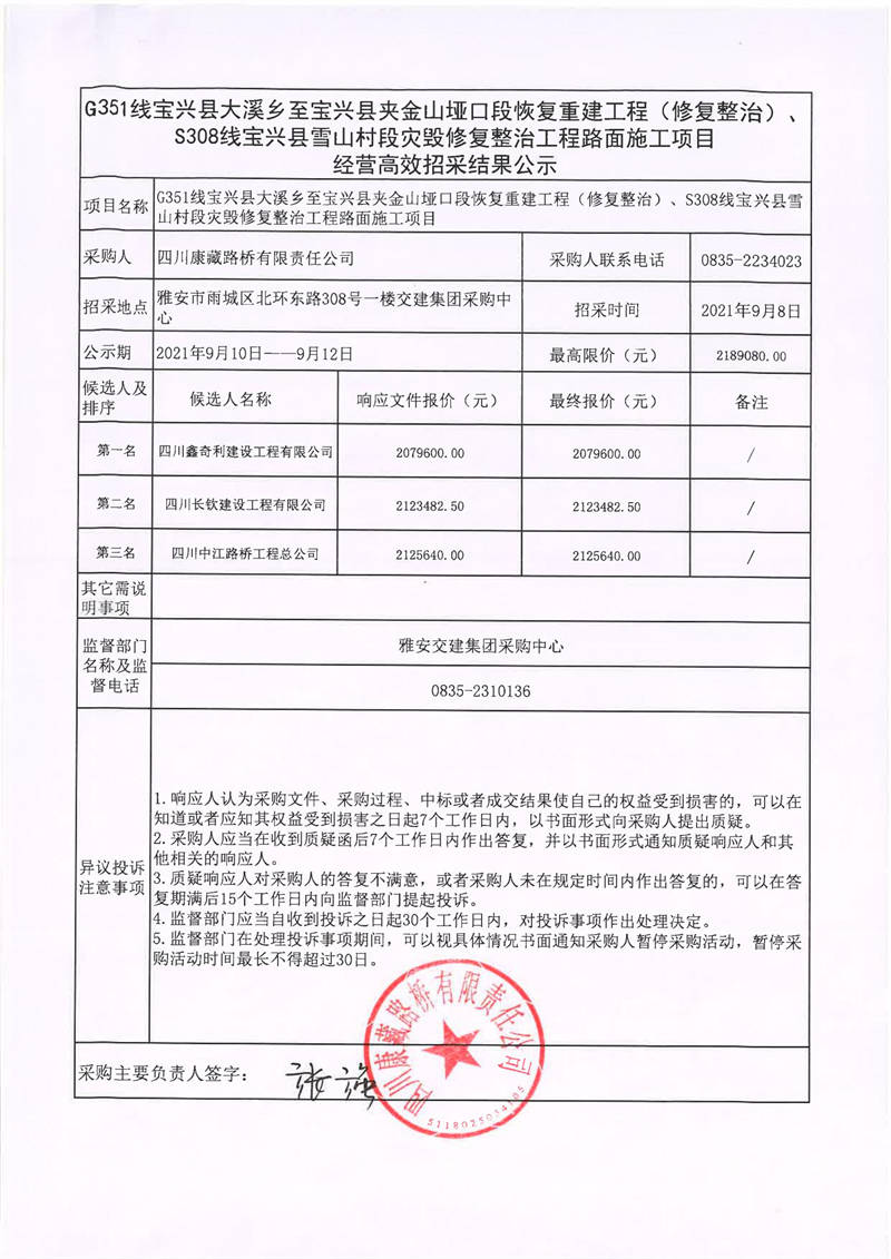 四川康藏路橋有限責任公司G351線寶興縣大溪鄉(xiāng)至寶興縣夾金山啞口段恢復重建工程(修復整治)、S308線寶興縣雪山村段災毀修復整治工程路面施工項目經(jīng)營高效招采結果公示