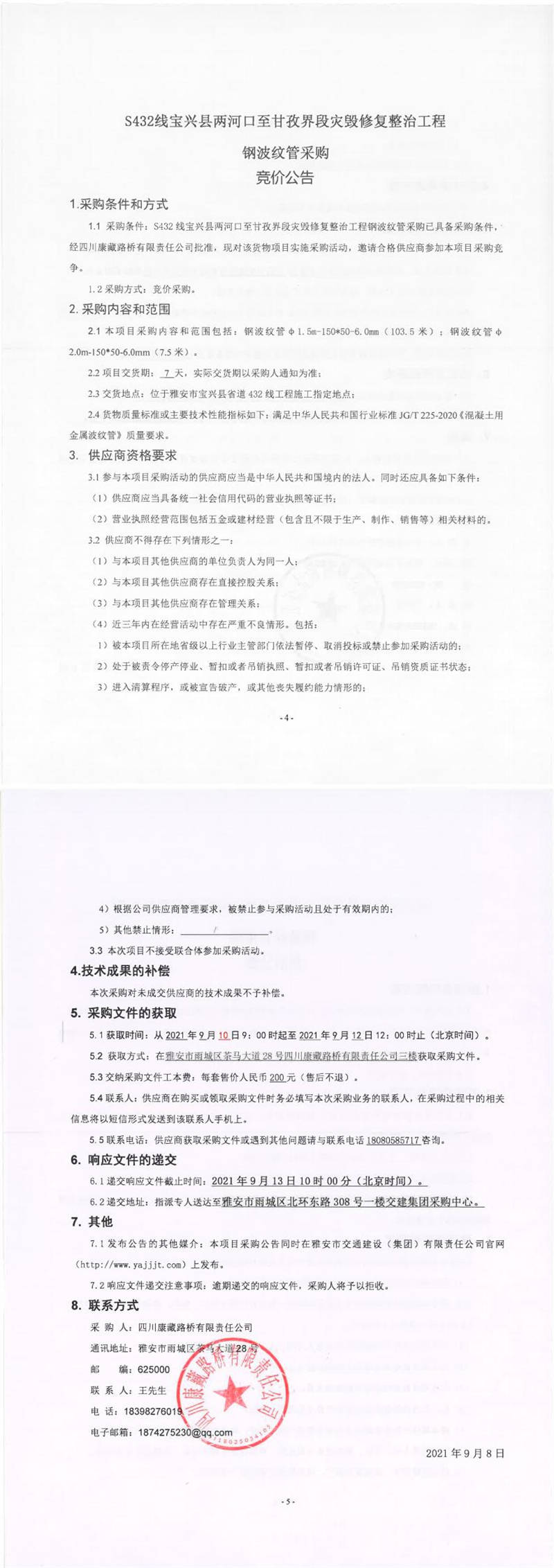 四川康藏路橋有限責任公司S432線寶興縣兩河口至甘孜界段災(zāi)毀修復整治工程鋼波紋管采購競價公告