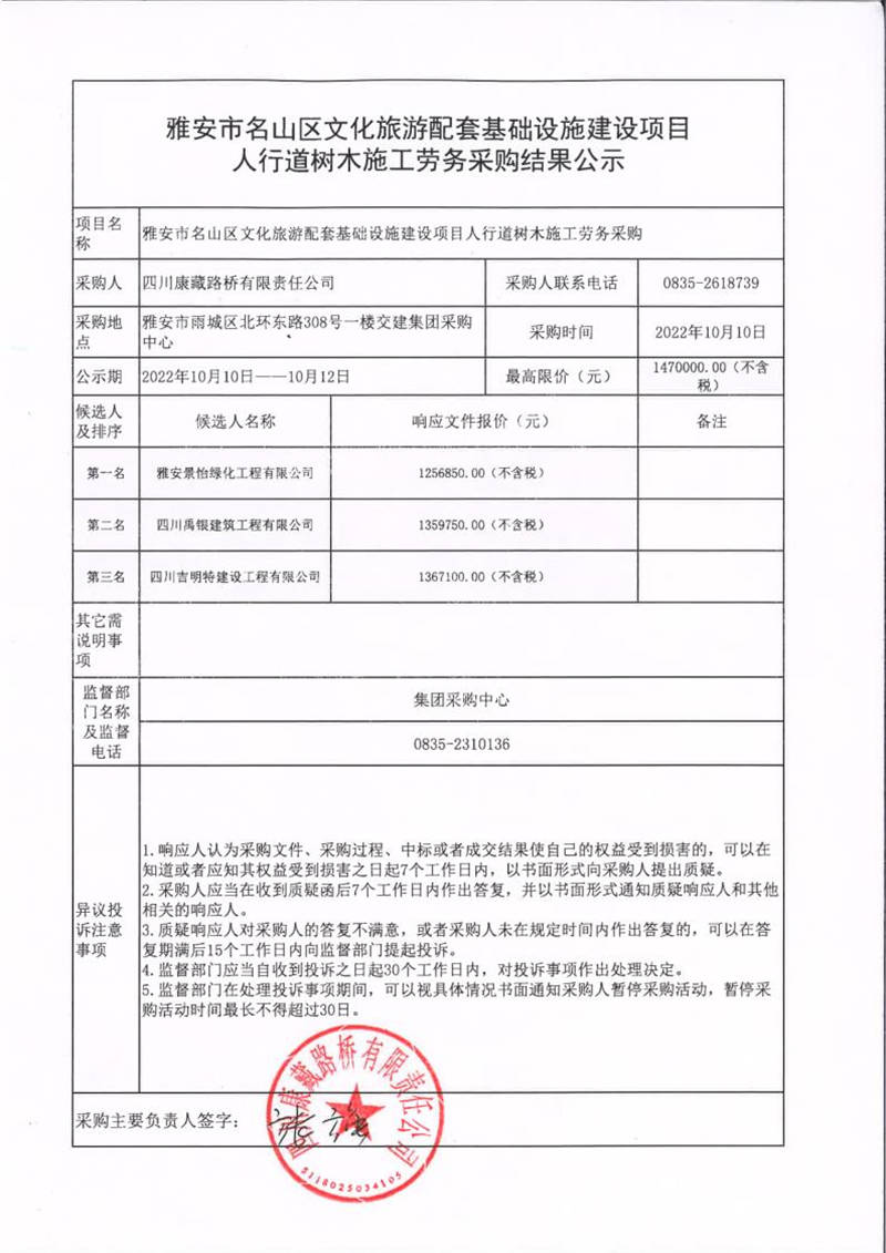 四川康藏路橋有限責(zé)任公司雅安市名山區(qū)文化旅游配套基礎(chǔ)設(shè)施建設(shè)項(xiàng)目人行道樹木施工勞務(wù)采購(gòu)結(jié)果公示