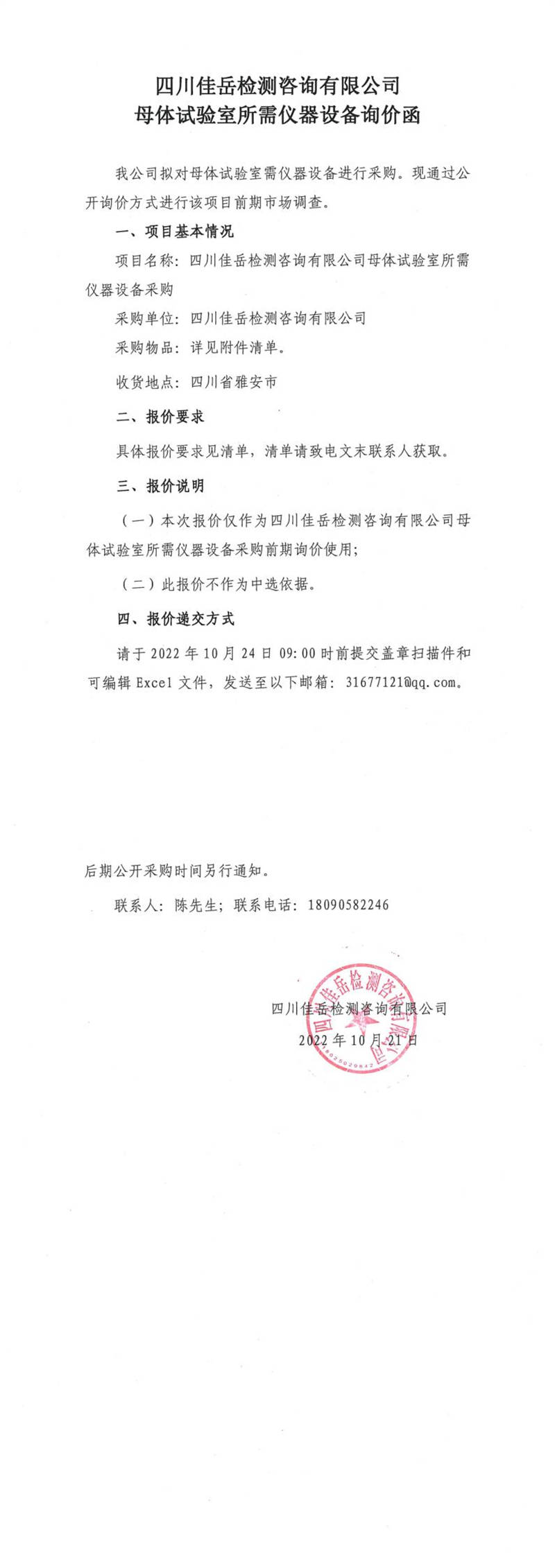 四川佳岳檢測(cè)咨詢有限公司母體試驗(yàn)室所需儀器設(shè)備詢價(jià)函