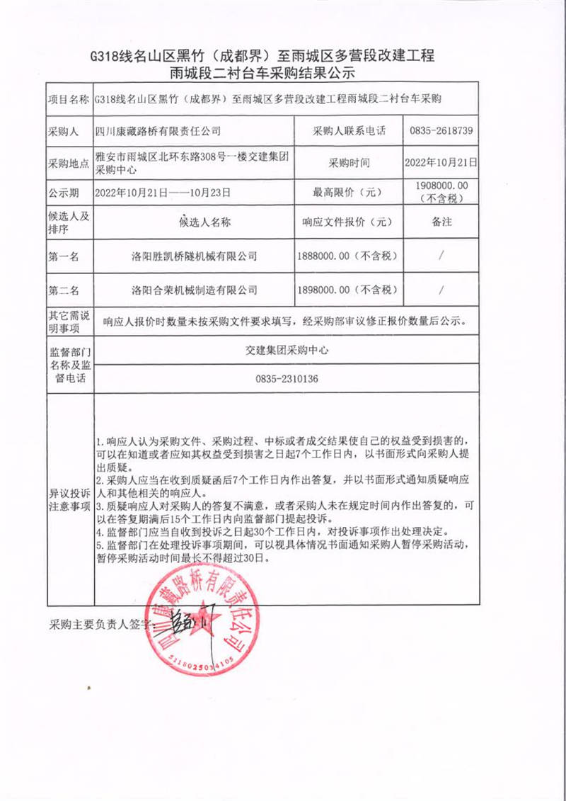 四川康藏路橋有限責任公司G318線名山區(qū)黑竹(成都界)至雨城區(qū)多營段改建工程雨城段二襯臺車采購結(jié)果公示