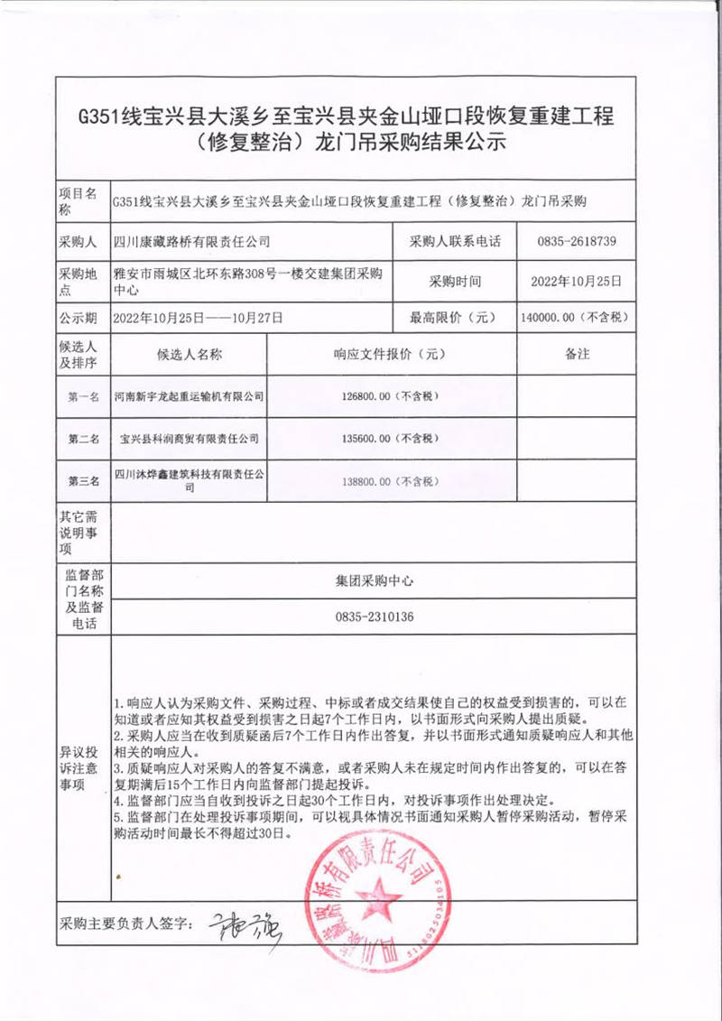 四川康藏路橋有限責(zé)任公司G351線寶興縣大溪鄉(xiāng)至寶興縣夾金山埡口段恢復(fù)重建工程(修復(fù)整治)龍門(mén)吊采購(gòu)結(jié)果公示