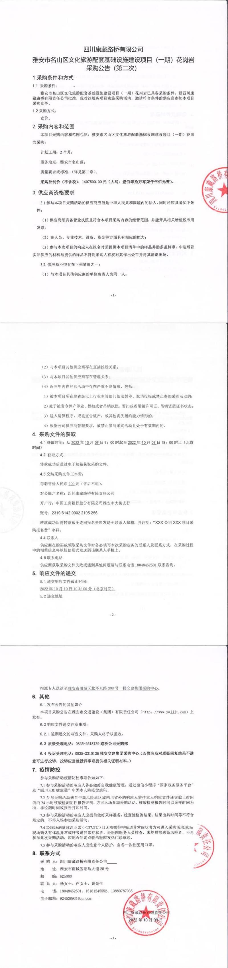 四川康藏路橋有限責任公司雅安市名山區(qū)文化旅游配套基礎設施建設項目(一期)花崗巖采購公告(第二次)