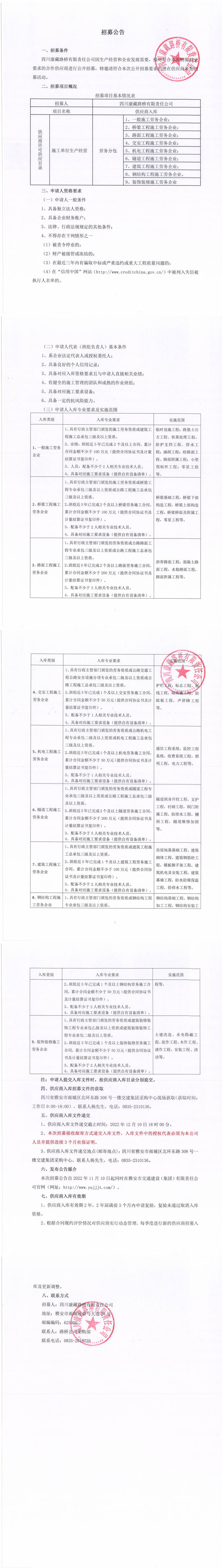 四川康藏路橋有限責(zé)任公司2022年第四季度供應(yīng)商入庫(kù)招募公告