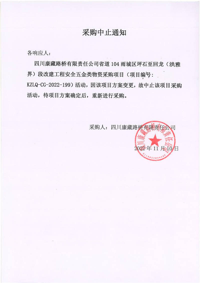 四川康藏路橋有限責(zé)任公司省道104雨城區(qū)坪石至回龍(洪雅界)段改建工程安全五金類(lèi)物資采購(gòu)項(xiàng)目采購(gòu)中止通知