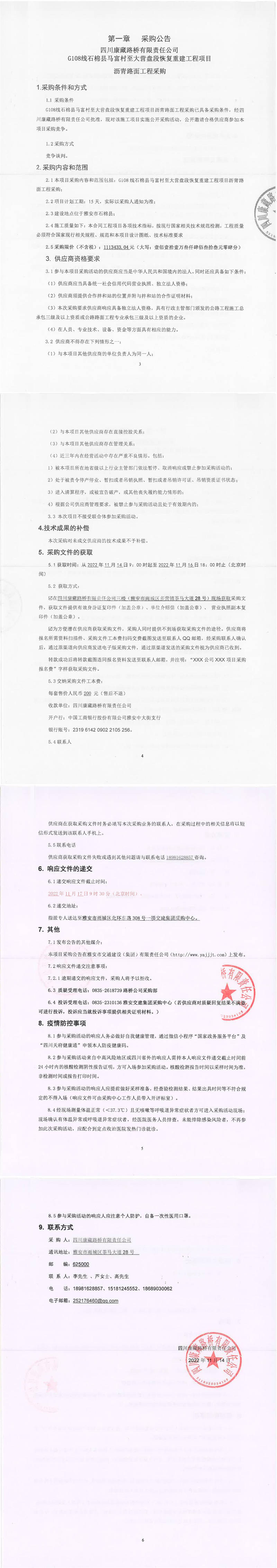 四川康藏路橋有限責(zé)任公司G108線石棉縣馬富村至大營(yíng)盤(pán)段恢復(fù)重建工程項(xiàng)目瀝青路面工程采購(gòu)公告