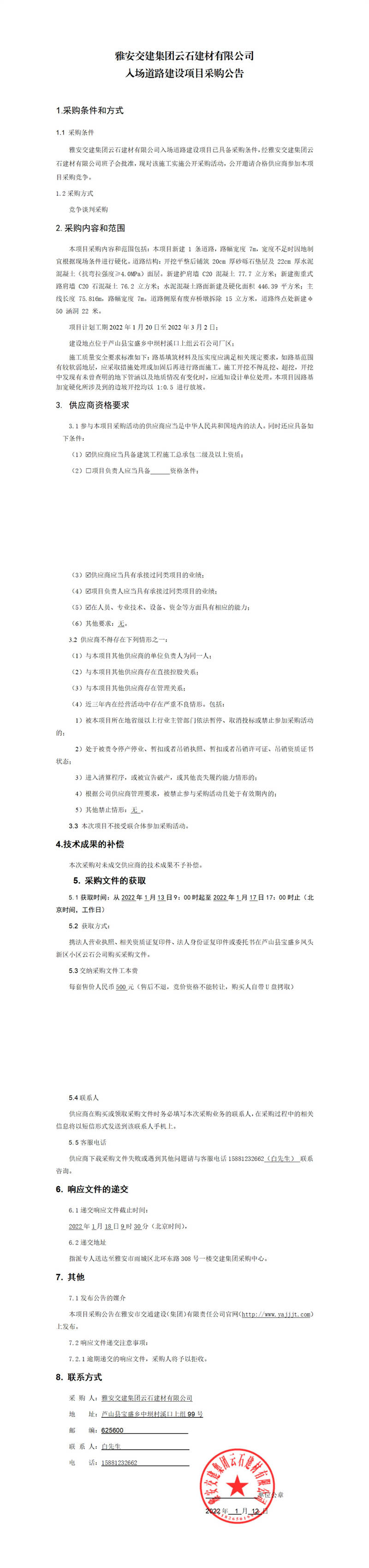雅安交建集團云石建材有限公司入場道路建設(shè)項目采購公告