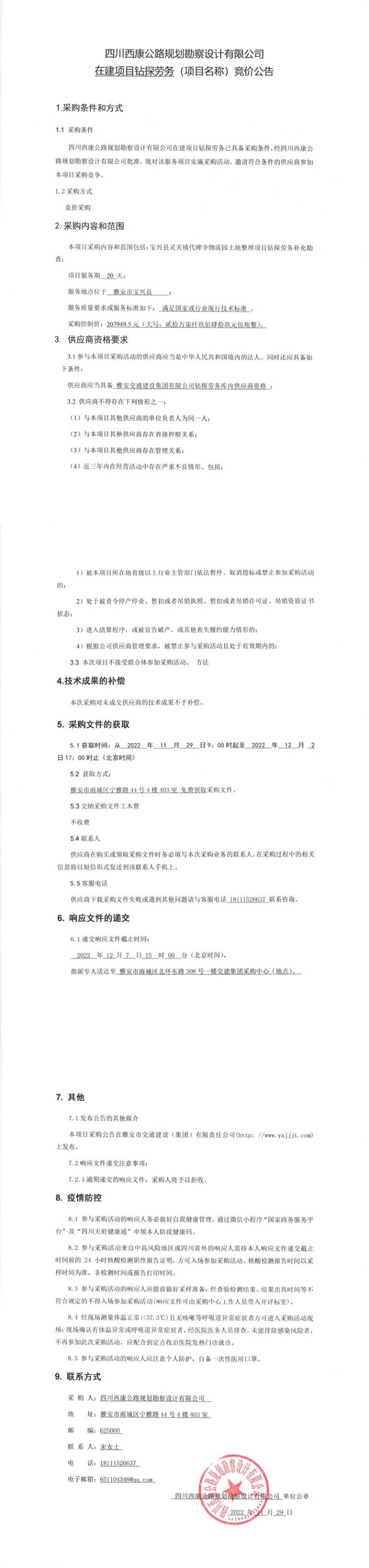 四川西康公路規(guī)劃勘察設(shè)計有限公司在建項目鉆探勞務競價公告