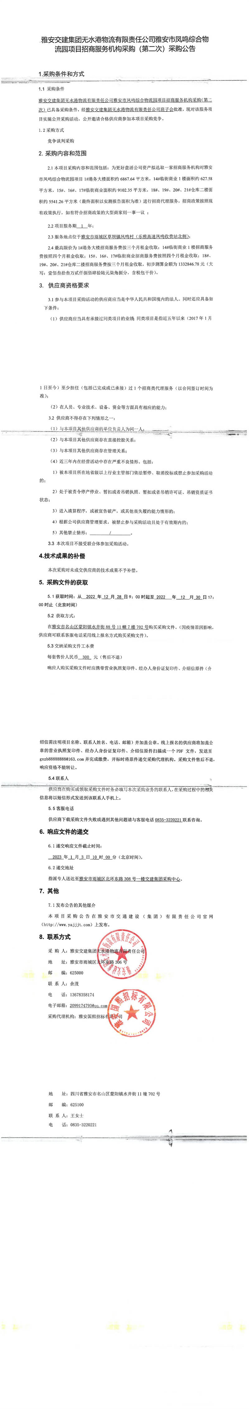 雅安交建集團(tuán)無(wú)水港物流有限責(zé)任公司雅安市鳳鳴綜合物流園項(xiàng)目招商服務(wù)機(jī)構(gòu)采購(gòu)(第二次)采購(gòu)公告