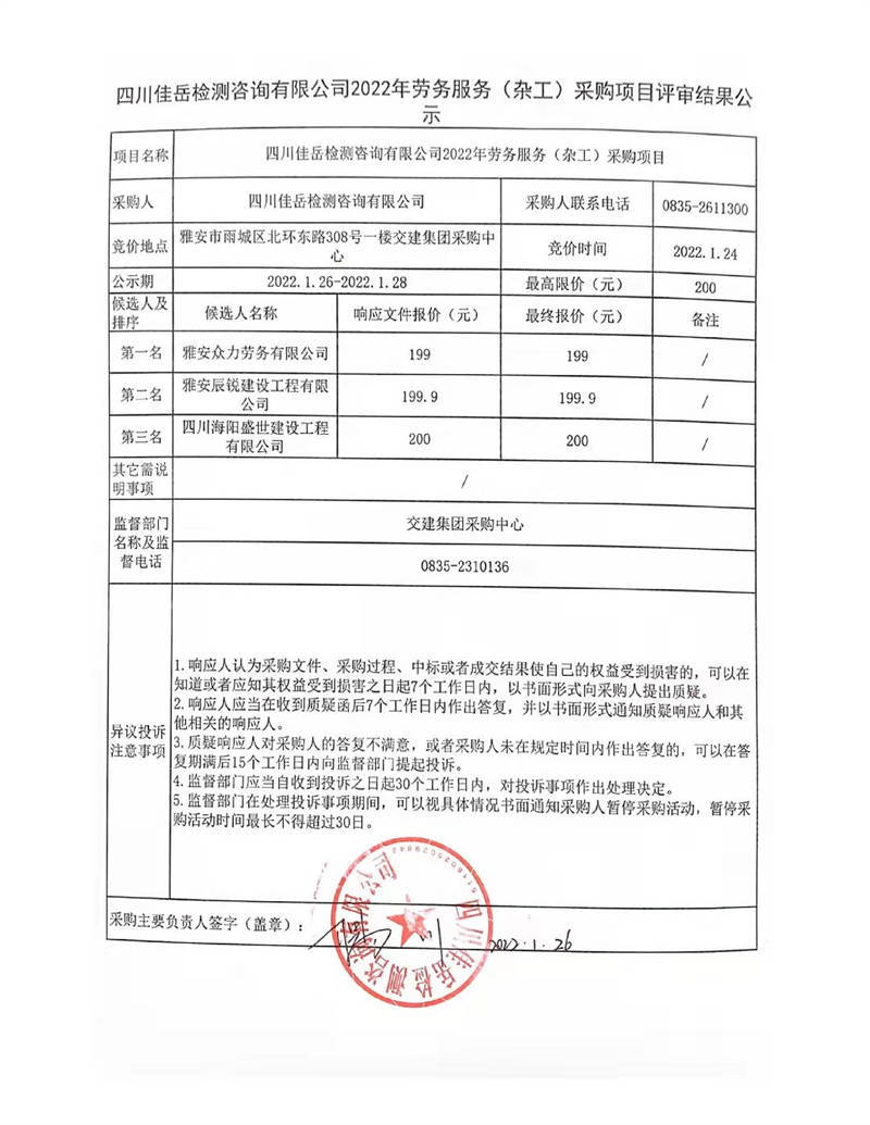 四川佳岳檢測咨詢有限公司2022年勞務(wù)服務(wù)(雜工)采購項(xiàng)目評審結(jié)果公示