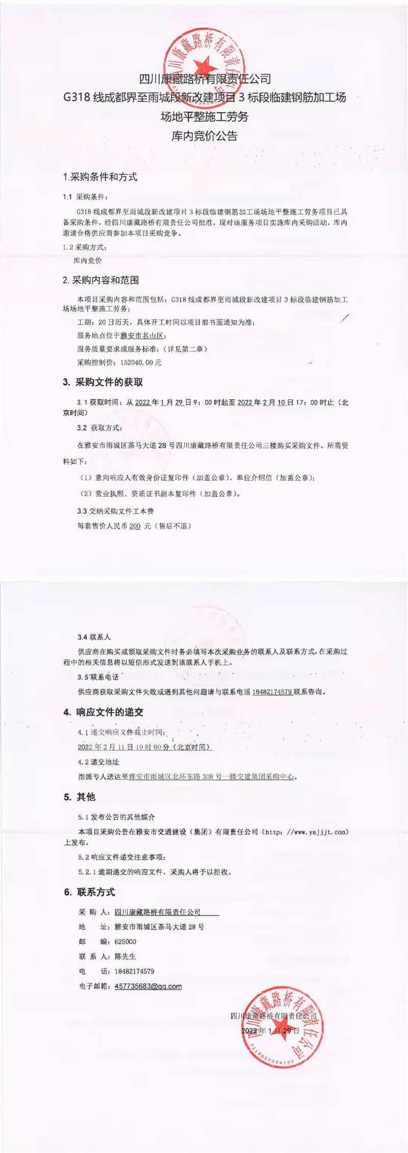 四川康藏路橋有限責(zé)任公司G318線成都界至雨城段新改建項(xiàng)目3標(biāo)段臨建鋼筋加工場(chǎng)場(chǎng)地平整施工勞務(wù)庫(kù)內(nèi)競(jìng)價(jià)公告