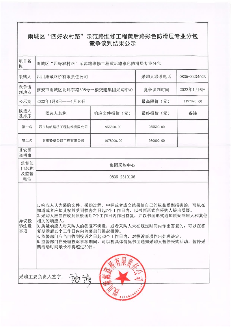 四川康藏路橋有限責任公司雨城區(qū)“四好農(nóng)村路”示范路維修工程黃后路彩色防滑層專業(yè)分包競爭談判結果公示