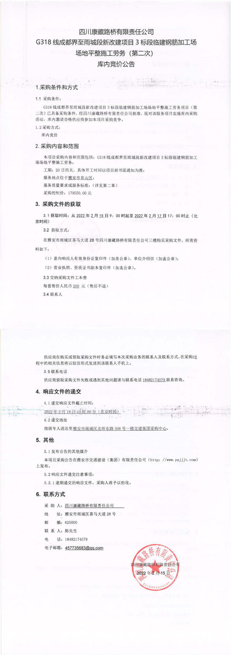 四川康藏路橋有限責任公司G318線成都界至雨城段新改建項目3標段臨建鋼筋加工場場地平整施工勞務(第二次)庫內競價公告