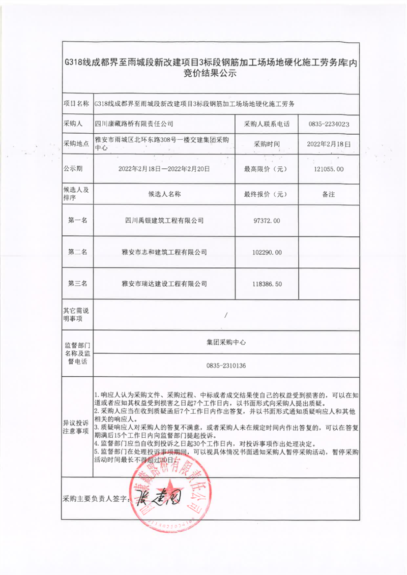 四川康藏路橋有限責任公司G318線成都界至雨城段新改建項目3標段鋼筋加工場場地硬化施工勞務庫內競價結果公示