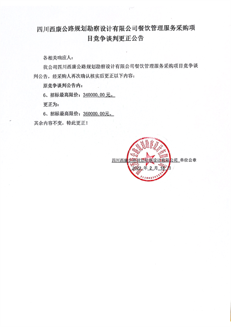 四川西康公路規(guī)劃勘察設(shè)計(jì)有限公司餐飲管理服務(wù)采購(gòu)項(xiàng)目競(jìng)爭(zhēng)談判更正公告(第二次)