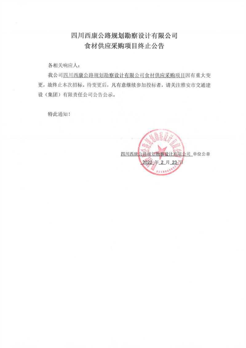 四川西康公路規(guī)劃勘察設(shè)計有限公司食材供應(yīng)采購項目終止公告