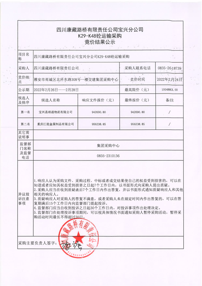 四川康藏路橋有限責任公司寶興分公司K29-K48砼運輸采購競價結果公示