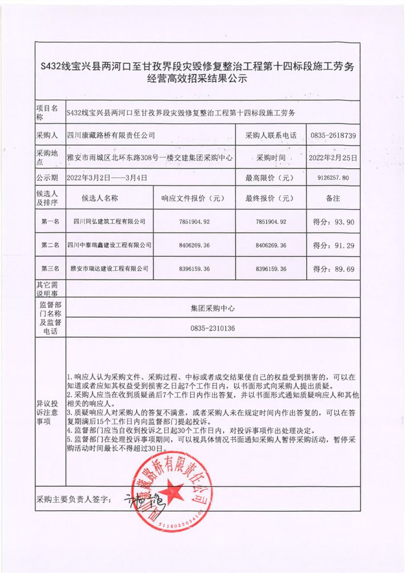 四川康藏路橋有限責任公司S432線寶興縣兩河口至甘孜界段災毀修復整治工程第十四標段施工勞務經營高效招采結果公示