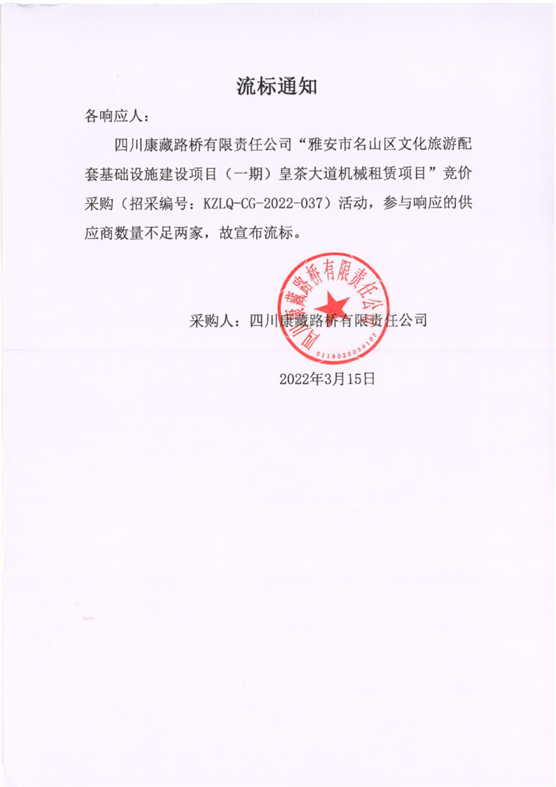 四川康藏路橋有限責(zé)任公司雅安市名山區(qū)文化旅游配套基礎(chǔ)設(shè)施建設(shè)項(xiàng)目(一期)皇茶大道機(jī)械租賃項(xiàng)目流標(biāo)通知