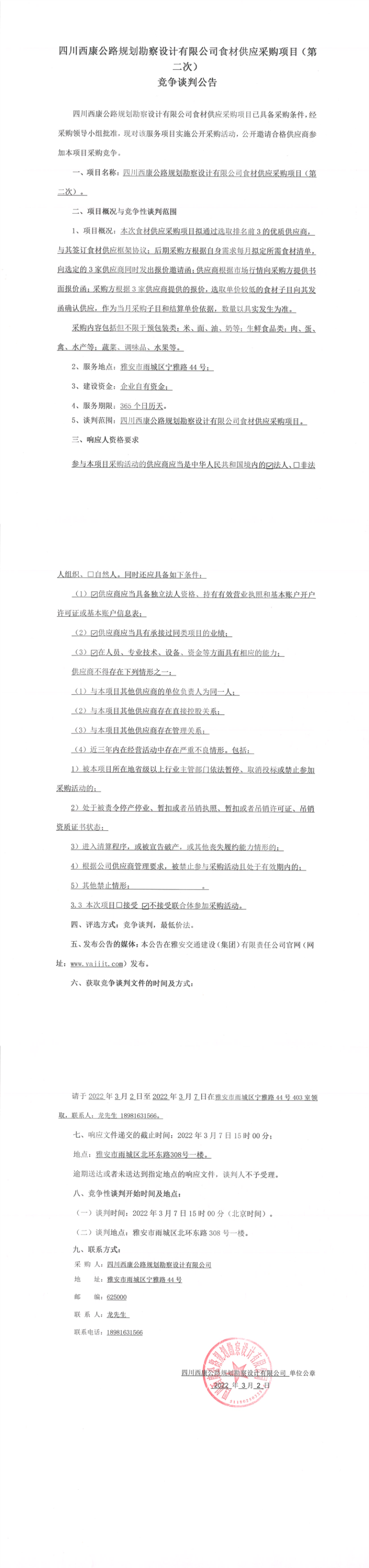 四川西康公路規(guī)劃勘察設(shè)計有限公司食材供應(yīng)采購項目(第二次)競爭談判公告