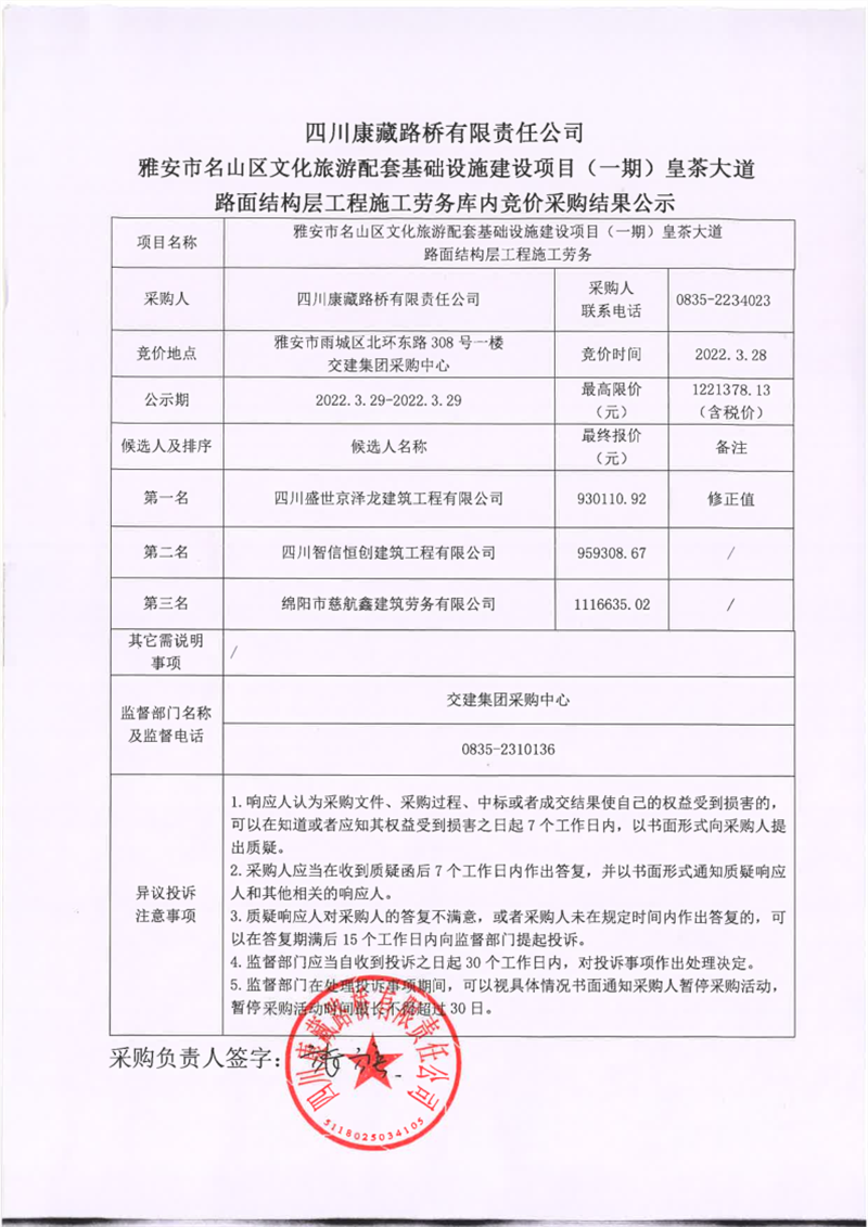 四川康藏路橋有限責任公司雅安市名山區(qū)文化旅游配套基礎設施建設項目(一期)路面結(jié)構層工程施工勞務庫內(nèi)競價采購結(jié)果公示