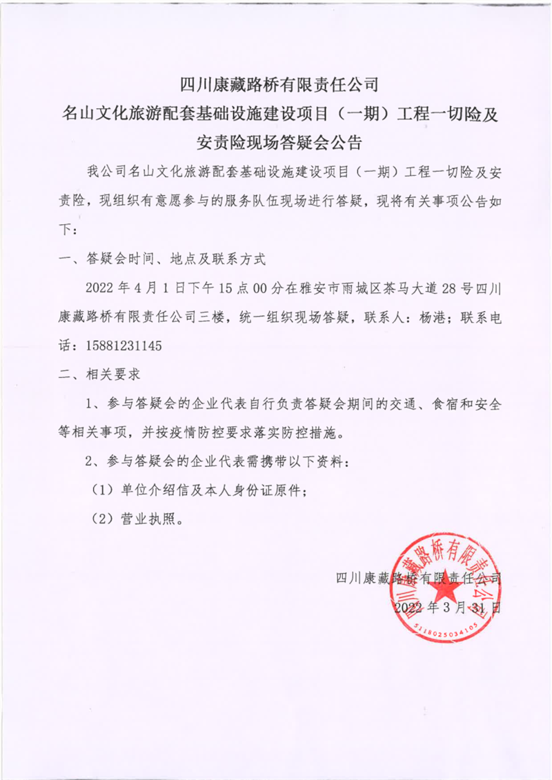 四川康藏路橋有限責(zé)任公司名山文化旅游配套基礎(chǔ)設(shè)施建設(shè)項(xiàng)目(一期)工程一切險(xiǎn)及安責(zé)險(xiǎn)現(xiàn)場(chǎng)答疑會(huì)公告