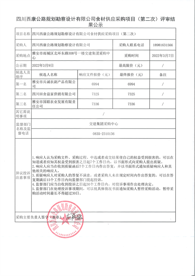 四川西康公路規(guī)劃勘察設(shè)計有限公司食材供應(yīng)采購項目(第二次)評審結(jié)果公示