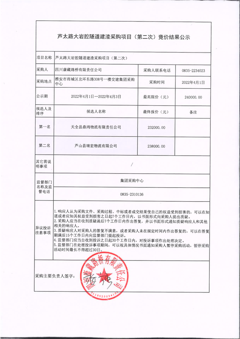 四川康藏路橋有限責(zé)任公司蘆太路大巖腔隧道建渣采購項(xiàng)目(第二次)競價(jià)結(jié)果公示